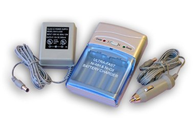 Features and Benefits * Great deal on a fast charger for both in house and travel charging * Recharges 2 or 4 pieces Size AAA, AA Ni-MH & Ni-Cd batteries in 2-3 hours * Includes "intelligent" microprocessor controlled charging, identifies defective cells and a safety timer for complete overcharge protection * Powered by an external AC adaptor for both indoor use or for in car usage by a cigarette lighter plug to your car. * Also recharges inside a car with the included cigarette lighter plug to your 12V car battery * Negative Delta V Cut off feature to 100% protect your batteries * With mechanical design against wrong polarity and short circuit protection * Automatic charge current selection for AA & AAA batteries * Red LED indicates charging; green LED indicates charging completed and charger is in "trickle charge" mode * Especially designed for rechargeable batteries used in Digital Camera, Handheld PC, PAD, Game Boy and CD players and other high drain rate electronic devices.